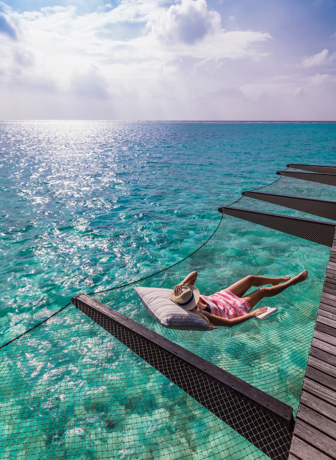 Immerse yourself in the breathtaking views of the Indian Ocean from your villa which features a king-size bed and floor-to-ceiling windows. Enjoy a separate living space, a wide-windowed bathroom with an oversized tub, and a split-level wooden deck with wrap-around netted hammocks, complemented by a coconut-thatched covered veranda.